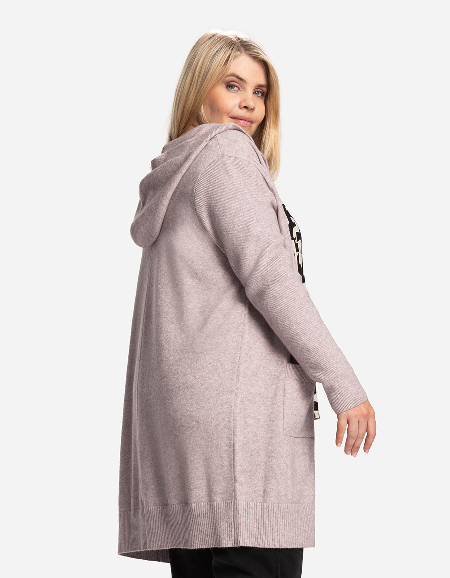 Unser Model ist 174 cm groß und trägt Größe 42/44.