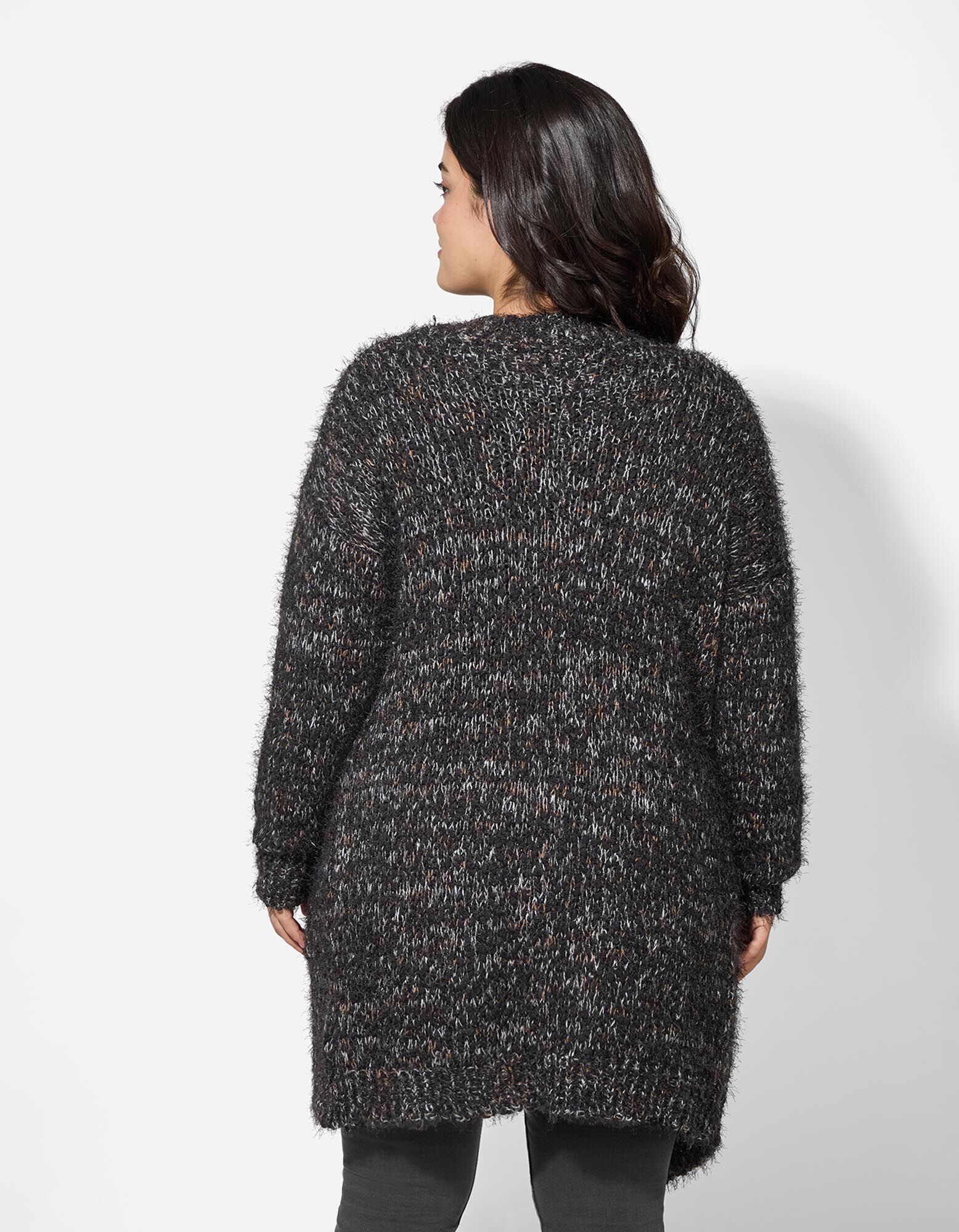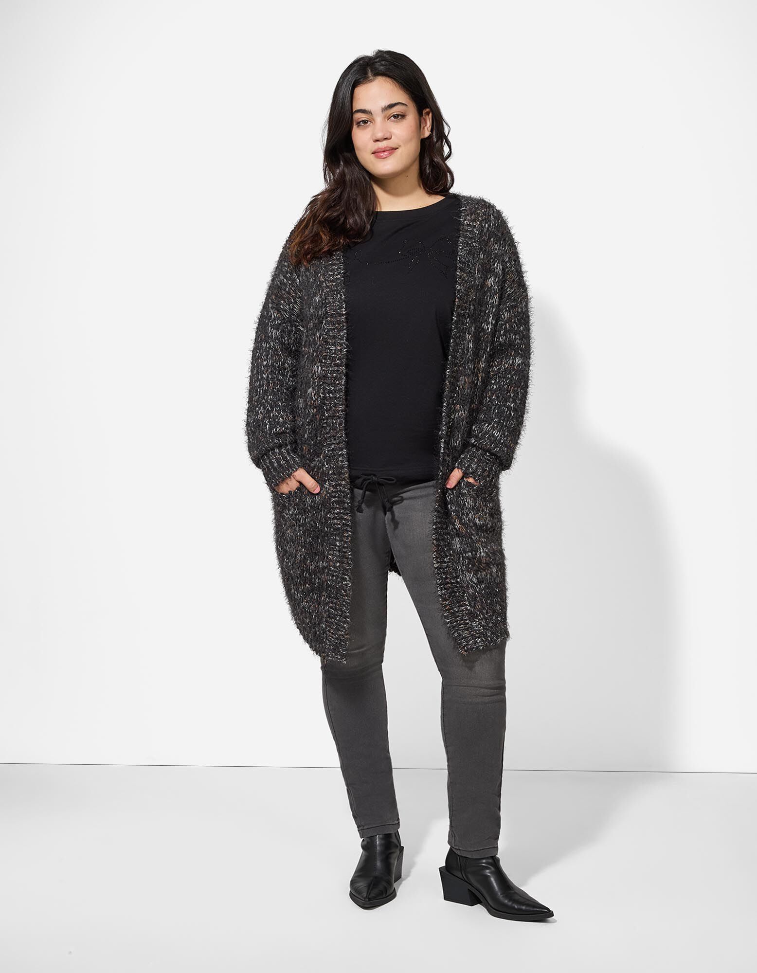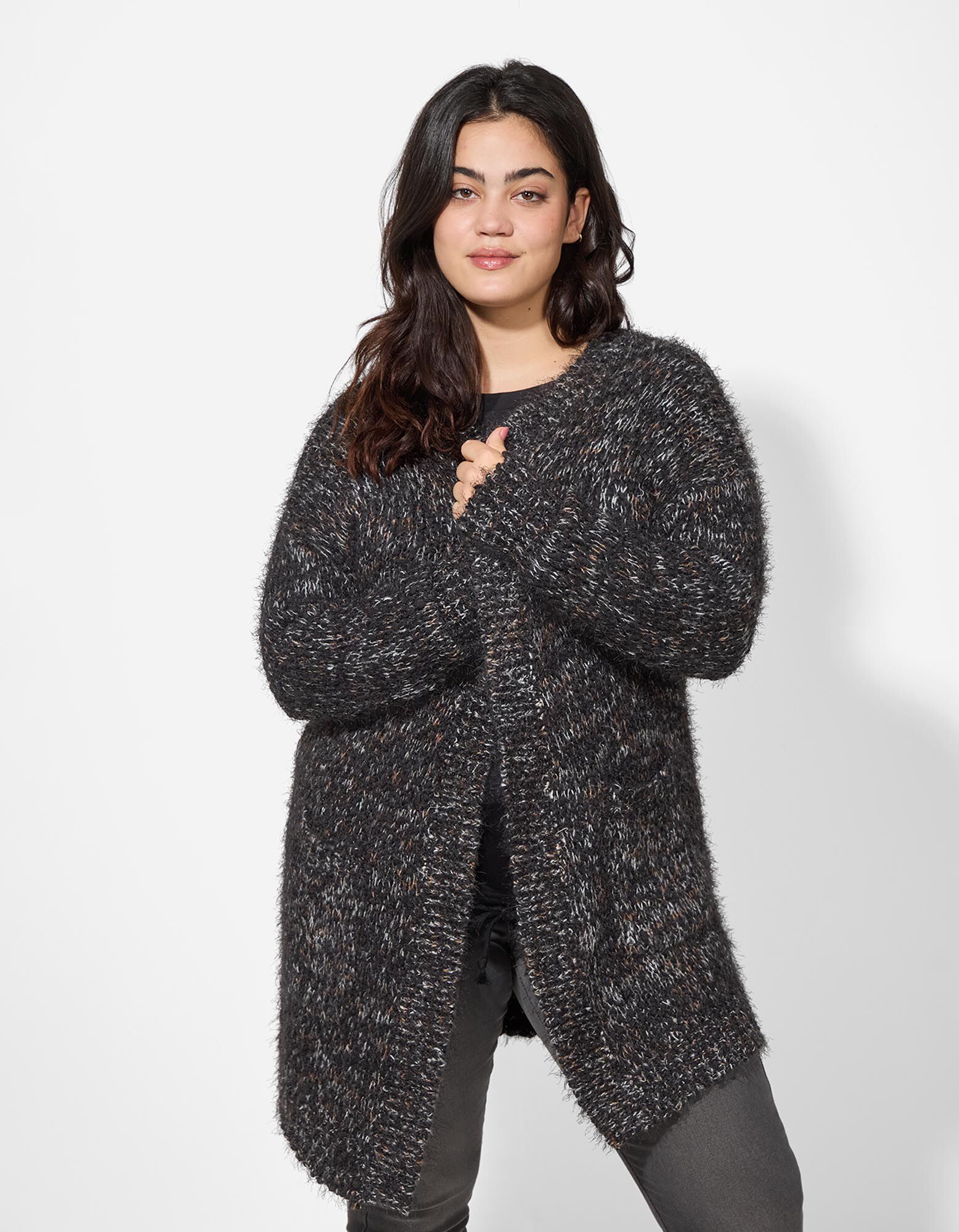 Naš model je visok 175 cm i nosi veličinu 42/44.